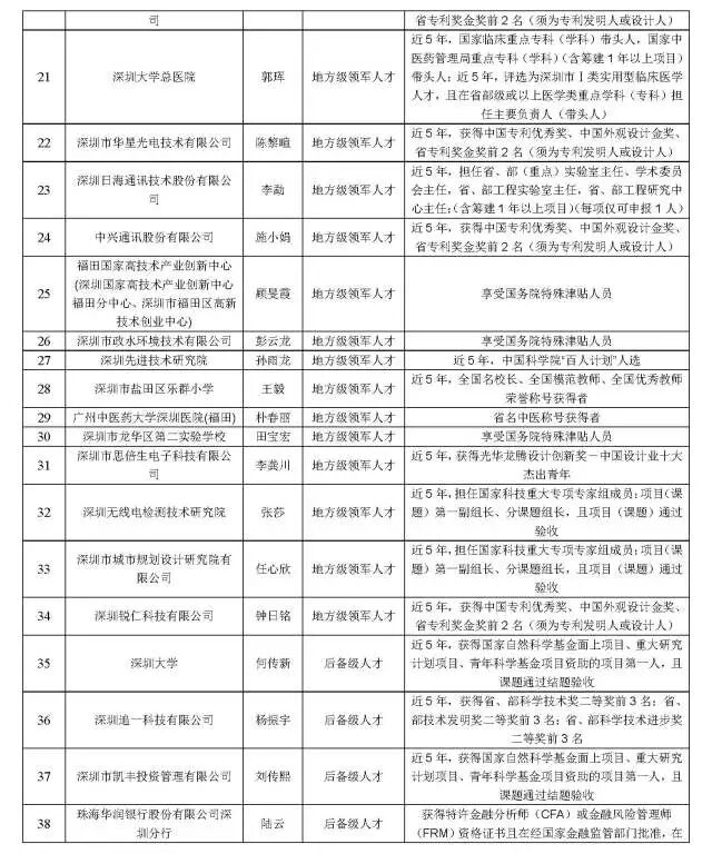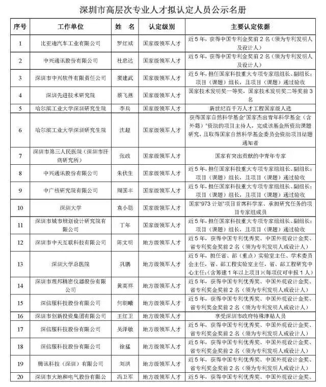 附:深圳市高层次专业人才拟认定人员公示名册