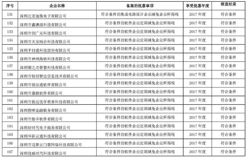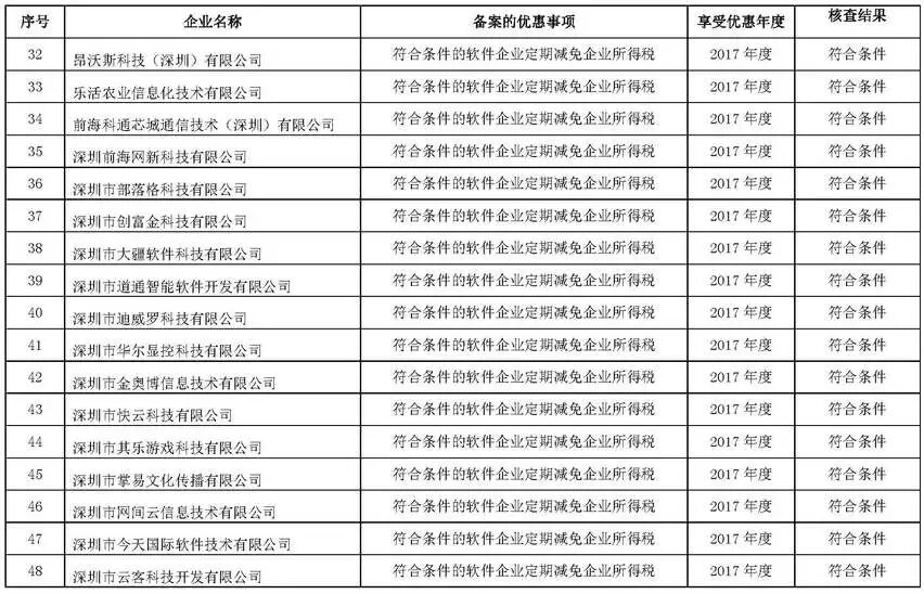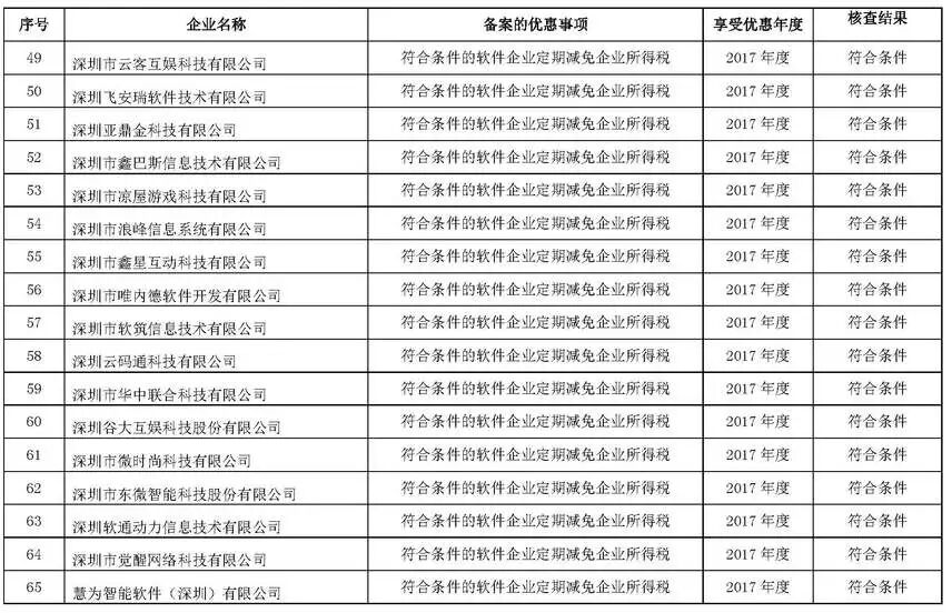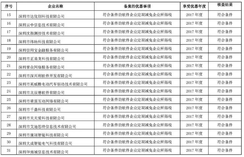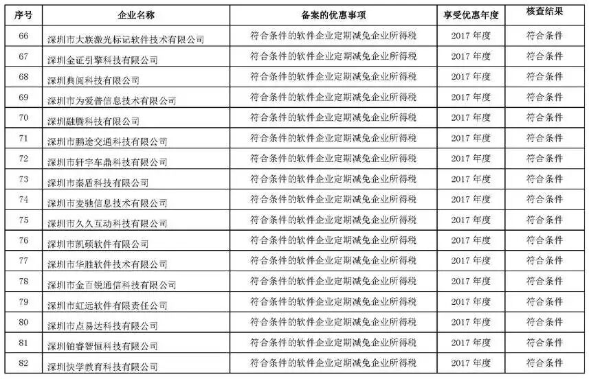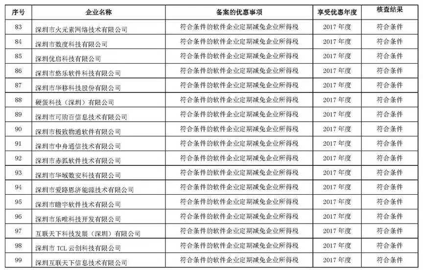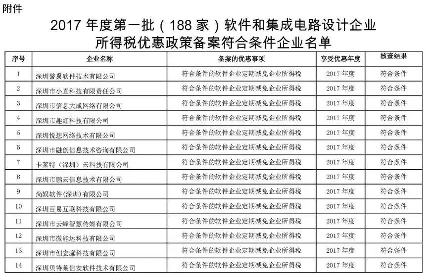 根据财政部、税务总局、发改委、工信部联合印发的《关于软件和集成电路产业企业所得税优惠政策有关问题的通知》(财税〔2016〕49号)及《市经贸信息委关于落实软件和集成电路产业企业所得税优惠政策有关事项的通知》(深经贸信息电子字〔2016〕71号)规定,经委托深圳市软件行业协会开展核查,现将符合享受2017年度深圳市软件企业、集成电路设计企业所得税优惠条件的第一批企业名单(详见附件)在深圳市经济贸易和信息化委员会网站(网址:http://www.szjmxxw.gov.cn)予以公示,欢迎社会各界监督。